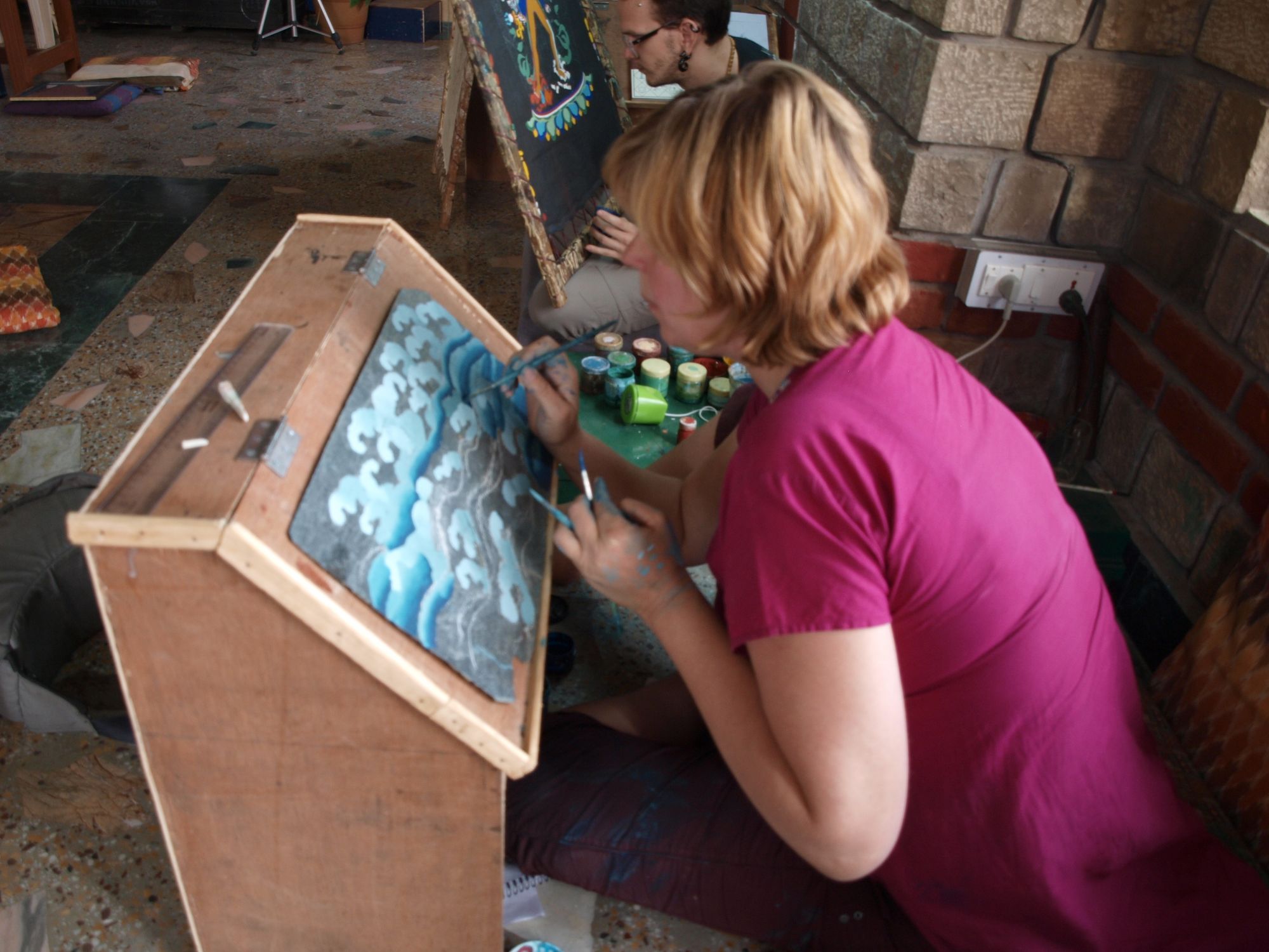 Op school in India. Hier ben ik in de Thangde Gatsal painting Studio in Dharamsala om thangka’s te leren schilderen